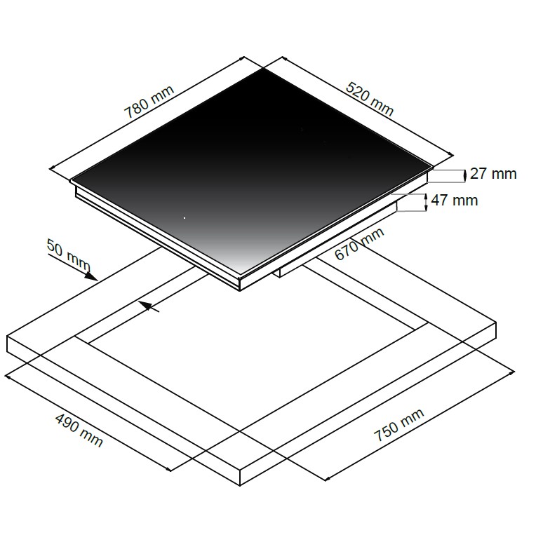 - Built-in (WxDxH): 750 x 490 x 47 mm