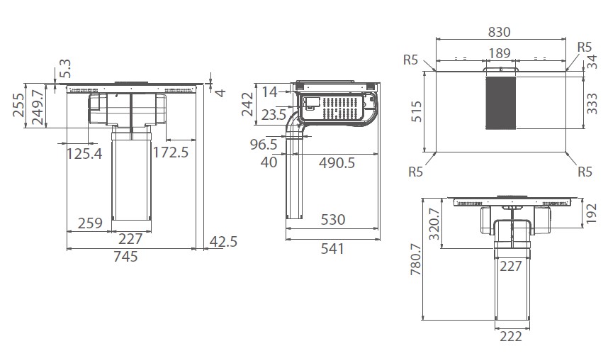 - Product (WxDxH): 830 x 515 x 250 mm